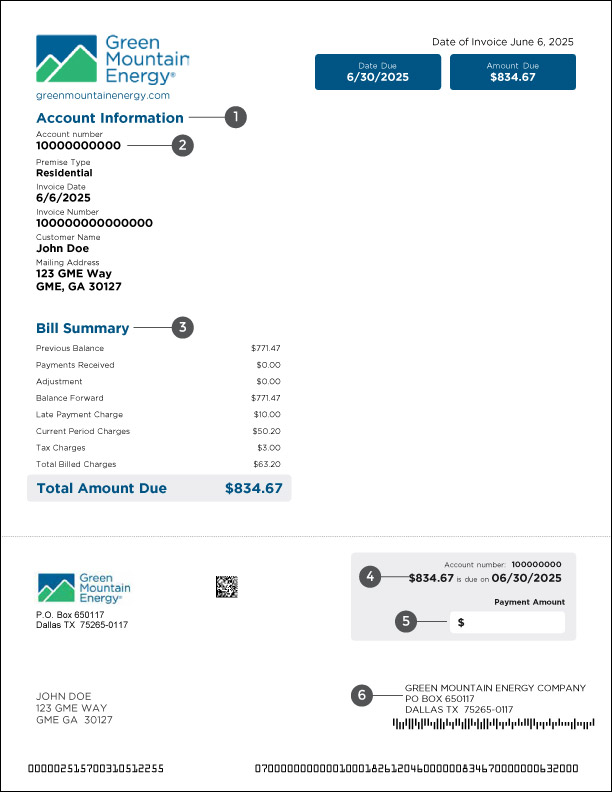 Let us shed some light on your Green Mountain Energy® electricity bill. Below you’ll find an image of your bill with details explaining each section. You can also learn more about how to pay your bill, or watch a video that will guide you through all the different terms.